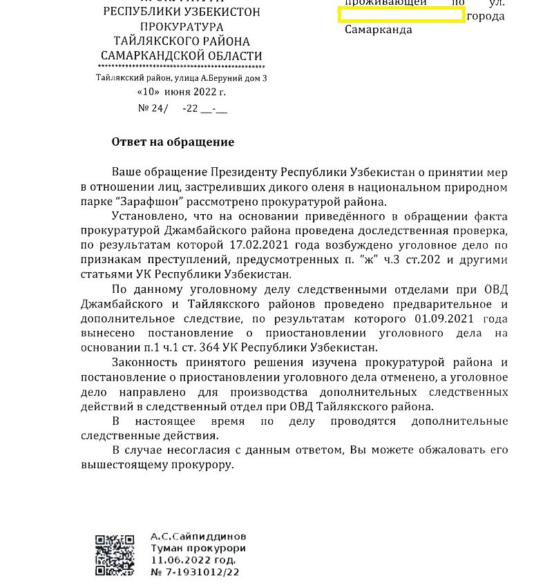 Дуланов заявил, что шкуру оленя он передал в прокуратуру Джамбайского района [Самаркандской области]. После этого прибыли представители ведомств правопорядка, и изучили ситуацию. Kun.uz связался с начальником отдела охраны экологии и окружающей среды Джамбайского района Обидом Рустамовым. Он подтвердил, что действительно на территории заповедника убили оленя, и сейчас этим делом занимается прокуратура. «В ходе расследования будет выявлено, кто убил оленя», - сказал он.