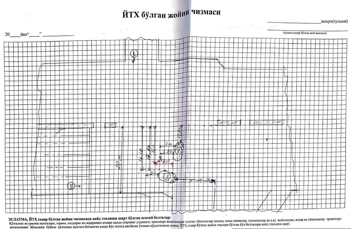Записали и зарисовали, что я двигался на разрешающий сигнал светофора. Вторая машина выехала с парковки с противоположной стороны дороги. Узнал имя водительницы - Сафарова Хулкар Норбек кизи. (Юрист, преподаватель конституционного права в Ташкентском государственном стоматологическом институте - прим. ред.)