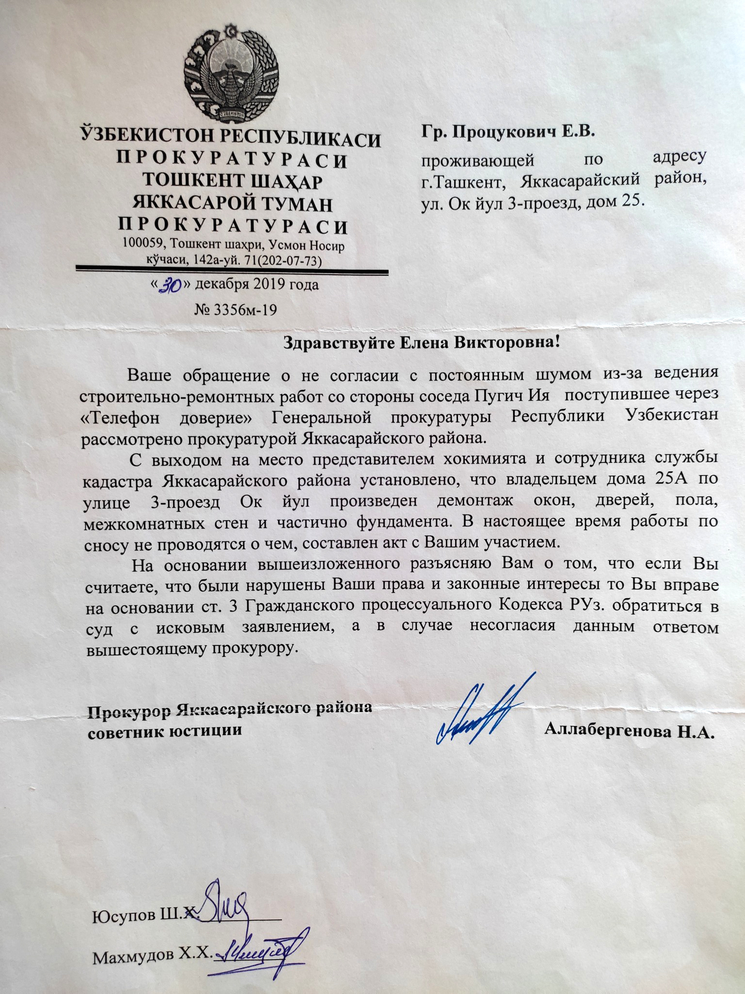 Но встает вопрос каким образом была совершена сделка без согласия и участия второго собственника? Почему начался снос части строения до [выплаты] полной компенсации как гласит закон? И почему все [государственные] органы игнорируют нарушения, упомянутые в моих обращениях? Каким образом решения хокима позволяет частным юридическим фирмам вроде OOO «MEGA LOGISTICS SERVICE» игнорировать все существующие законы и кодексы Республики Узбекистан?
