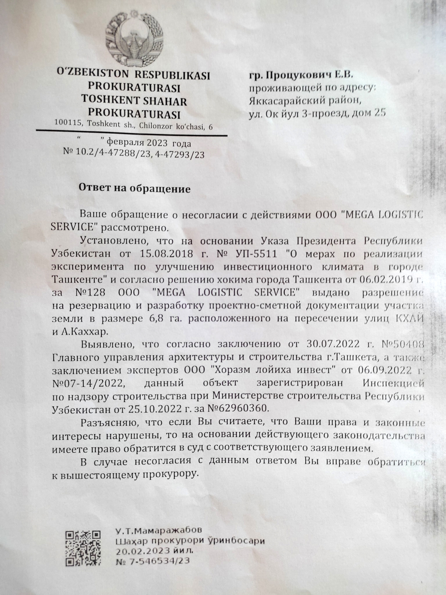 Суть обращения везде одна и та же. Прикрываясь решением хокима (главы администрации – ред.) г. Ташкента №128 от 06.02.2019 г. компания OOO «MEGA LOGISTICS SERVICE» приводит мою собственность в аварийное состояние.