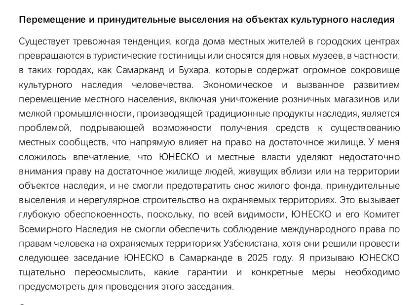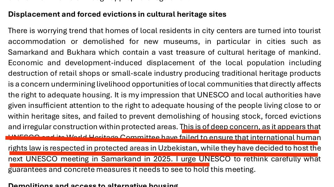 Вместо того, чтобы засучить рукава и заняться вычищением «авгиевых конюшен» эти «двое»: ЮНЕСКО и Узбекистан - решили проводить Годовую Конференцию 2025 в #samarkandscrossroadsofcultures (в Самарканде – ред.), устраивая танцы и пляски прямо посреди безвозвратно утраченных и утрачиваемых объектов культурного наследия, сносов, выселенных людей из домов в историческом центре, гостиниц-коробок, огромного Сити на месте снесенного памятника культуры и окружающих махаллей (кварталов – ред.), уродующихся гузаров (самаркандское название старинных кварталов – ред.), расширенных древних улиц, отворачиваясь от преступлений и коррупции...