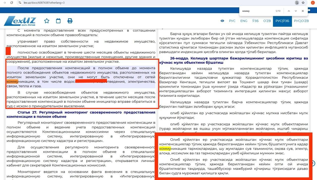 Даже если принять то, что «йирик ислом маркази» [крупный исламский центр], запланированный закрытым «махсус карором» (махсус қарор – специальный указ, - ред.) и «скрытым решением» депутатов - это «общественная нужда» (а свет-газ - нет), в соответствии с законом Республики Узбекистан 781 (и международным правом) люди не могут быть лишены коммунальных услуг до принудительного выселения через суд. И то, туда можно их подать, если люди продолжают жить более 6 месяцев в жилище, за которое получили компенсацию по соглашению и в полном объеме.