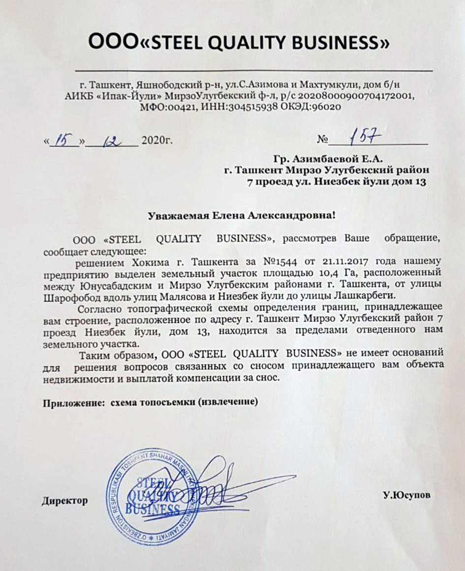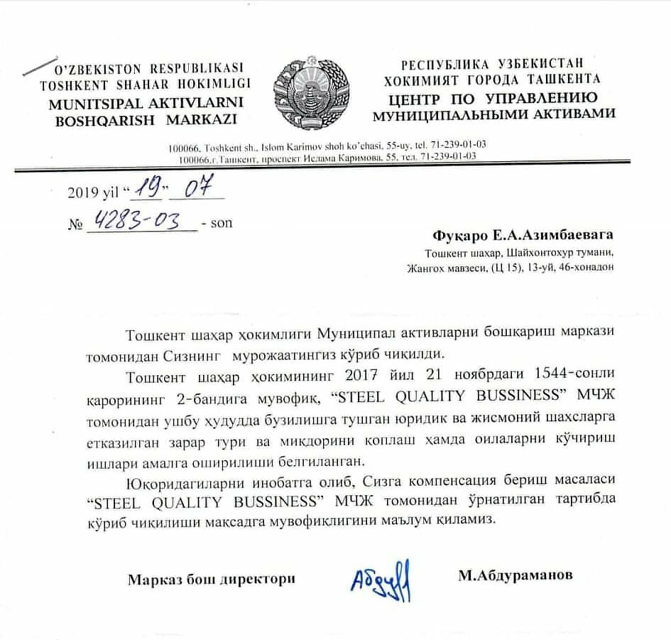 После появления этой информации у меня возникло два вопроса, которые я хочу задать господину А.Абдулхакову и господину М.Абдурахманову. Кто ответственен за фальсификацию сноса моего помещения, расположенного по адресу 7-й проезд Ниёзбек Йули, дом 13, и кто присвоил компенсацию за фиктивный снос данного помещения?