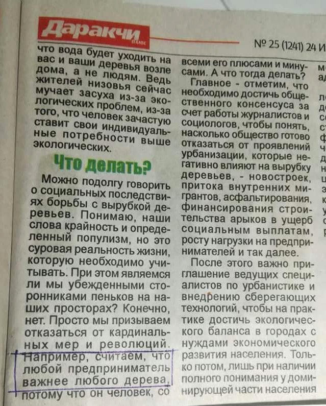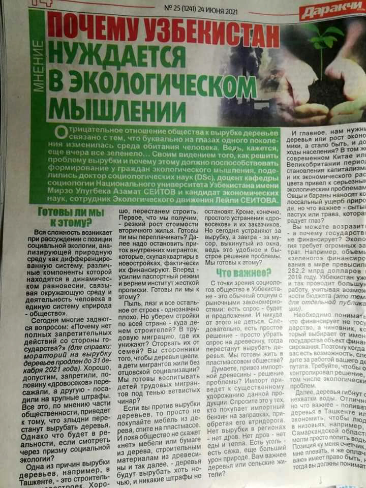 Более циничного оправдания уничтожению деревьев я ещё не встречала. Странно, что доктор социологии Азамат Сеитов встал на защиту всего лишь строительного и мебельного бизнеса. А как же трансплантология? Почему до сих пор не обязали всех граждан Узбекистан сдавать свои почки, печень, сердце, кровь на нужды такого дорогого бизнеса? Почему ещё люди ходят с головами на плечах? Ведь головы нужны для экспериментов новых технологий косметологии! Тоже доходный бизнес.