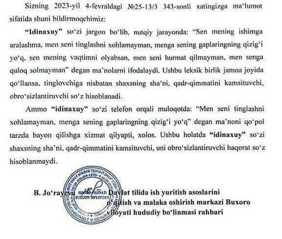 Толкование «идинaxyй» от профессора Б. Жураевой, доктора филологических наук, директора Бухарского отделения Центра повышения квалификации ведения делопроизводства на госязыке: