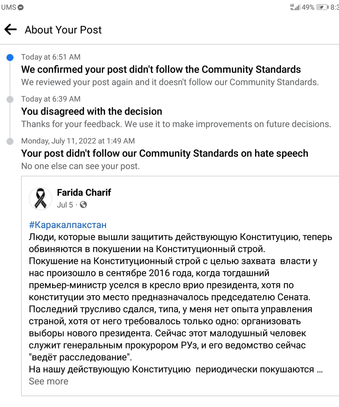 Ну вот, скажите, кто, кроме гэбни и гэбистских троллей, мог пожаловаться на этот пост? Фейсбук совсем потерял интеллект. Надо привлечь внимание Репортёров и других международных организаций к тому, как роботы Фейсбука взаимодействуют с ботами гэбни и блокируют нормальные посты нормальных людей. Нарушают таким образом принцип свободы самовыражения