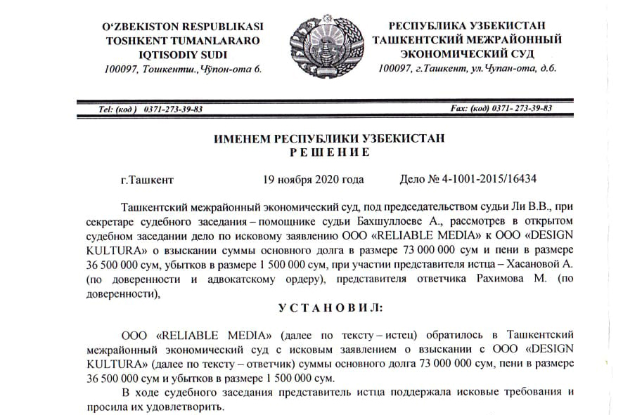 Все решения судов были в пользу моей компании ООО Reliable Media, так как услуги были оказаны в полном объеме, что подтверждается подписанными актами между нашими компаниями. Фотокопии решений судов прилагаю к посту. Можете с ними ознакомиться. В итоге суд взыскал в пользу ООО Reliable Media 478 252 744 сум.