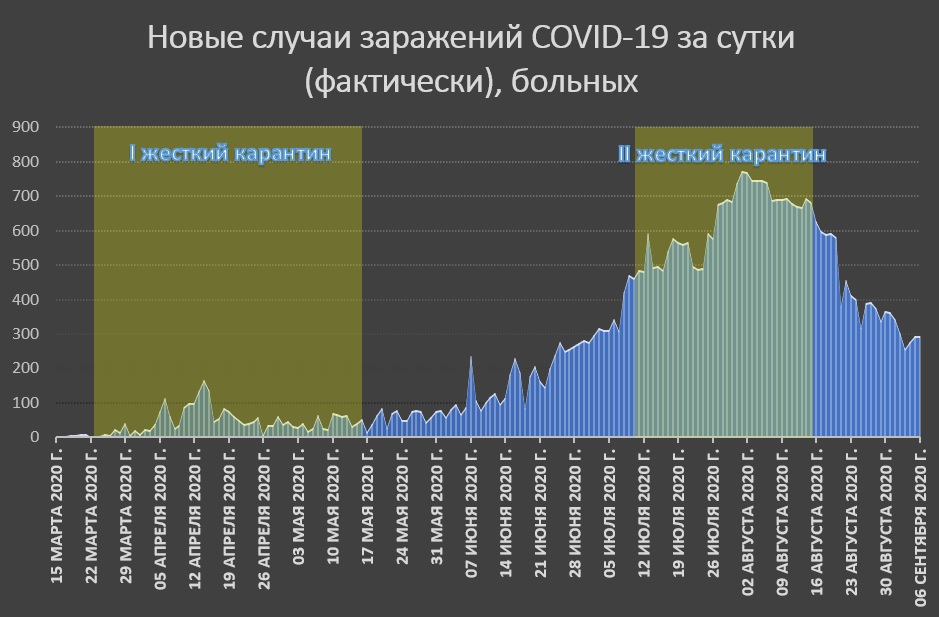 Но Минздрав даёт с 3 сентября сведения о не более трёхстах выявленных случаев в сутки. Как можно понять, что с 26 по 31 августа «число обращений по поводу острых респираторных заболеваний увеличилось с 2,2 тысячи до 3 тысяч, а звонков из-за повышения температуры тела - с 2 500 до 3 500» или по этим симптомам количество обращений увеличилось в 1,4 раза. При этом Минздрав показывает положительную динамику: 26 августа было выявлено 390 случаев заражения COVID-19, 27 – 393, 28 – 376, 29 – 337, 30 – 368 и 31 августа – 365 заболевших.