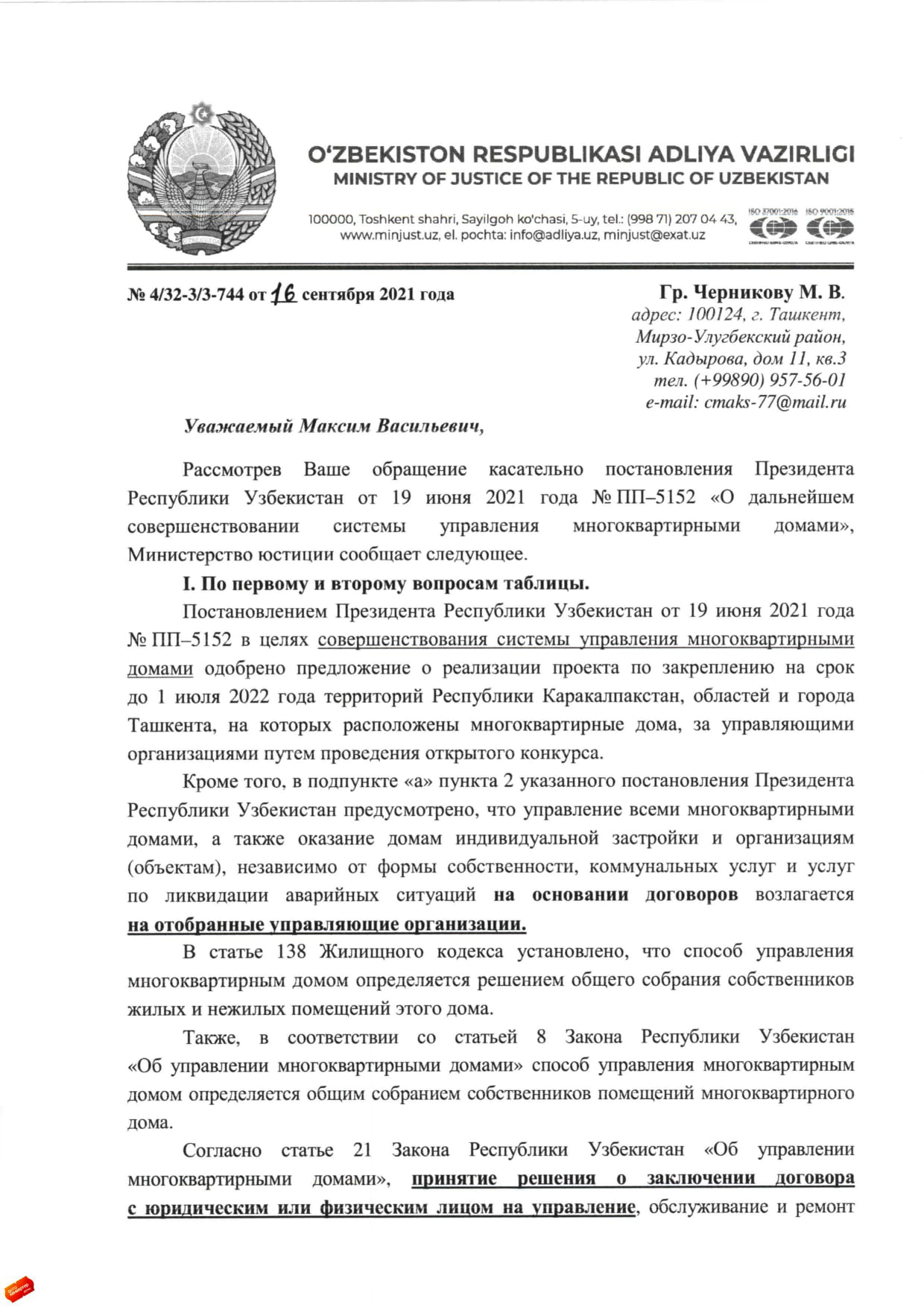 И вот получаю ответ от Минюста. Приведу выдержки из него: