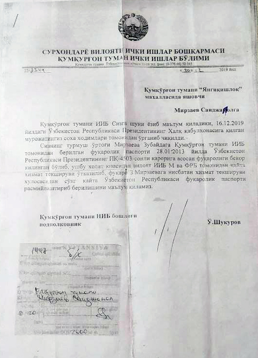 Пока в 2018 году, не пошла она менять свой зелёный паспорт гражданина республики Узбекистан, полученный в 1999 году, на новый биометрический паспорт. И когда она с мужем, пришла в РОВД своего района Сурхандарьи, выяснилось, что ее лишили гражданства. По указу президента 4503.