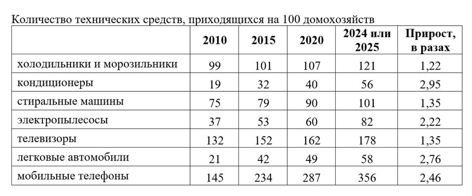 Так вот, Комитет по статистике начал публикацию данных выборочных обследований домохозяйств за 2025 г. о наличии той или иной техники в семьях. Но публикуются данные в день по чайной ложке, в лучших традициях мыльных опер. Я уже не выдержал, посмотрел прошлогодние результаты и составил табличку техниковооруженности домохозяйств.