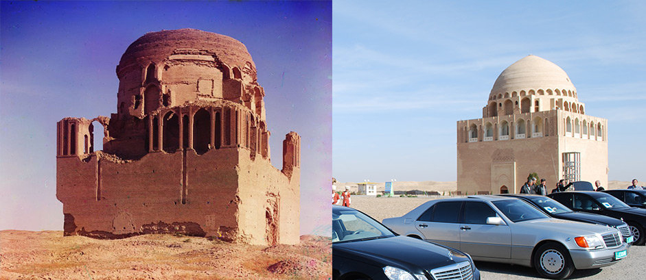 Совершенно иной пример представляют «реставрационные» работы, выполненные в начале 2000-х годов на знаменитом мавзолее султана Санджара в Мерве. Там работу доверили турецким специалистам, перед которыми была поставлена задача «полностью восстановить» известное сооружение. В результате новодел почти полностью поглотил памятник, а разрушенный купол был заменен новым и, как считают многие специалисты, скорее турецким и нехарактерным для среднеазиатской архитектуры 12 века. Возобладала идеология и геополитика.