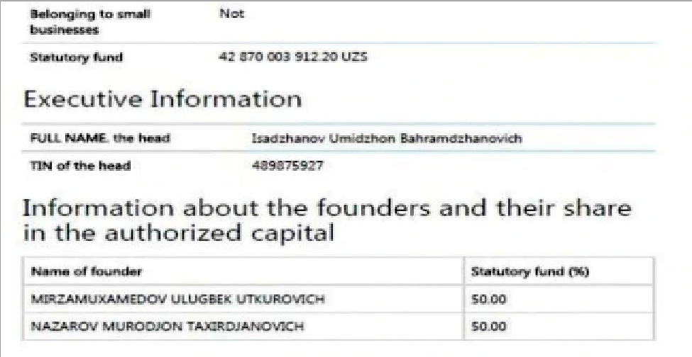 Редакция даже нашла документы этого частного предприятия, учрежденного Мирзамухамедовым и Назаровым (каждому принадлежит по 50 % уставного капитала). Судя по их содержанию, компания инвестировала средства в снос дома №7 по улице Бабура в Ташкенте, ныне признанного памятником архитектуры, и строительство на его месте 16-этажного комплекса.