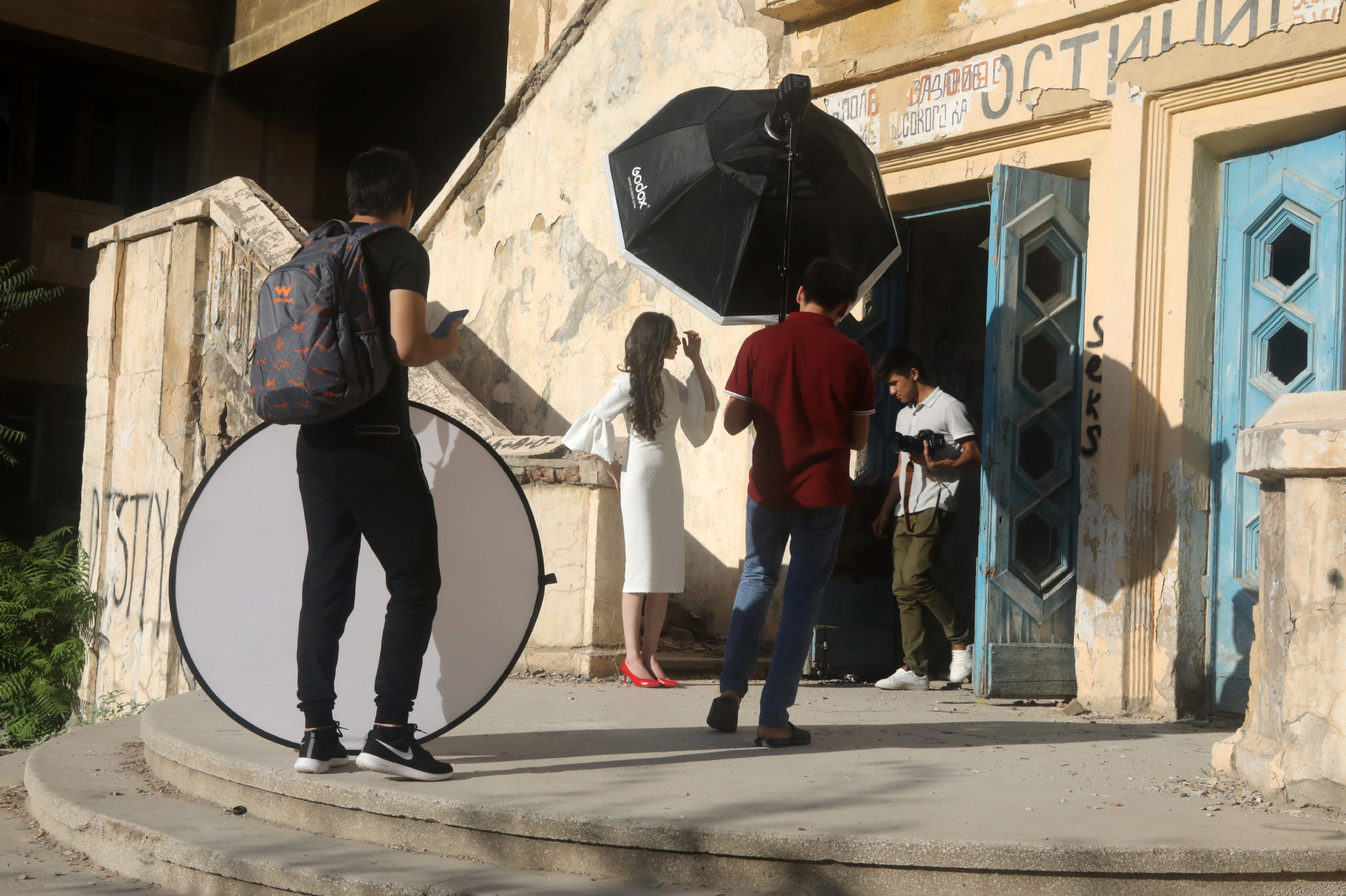 Съемка на фоне заброшенного здания