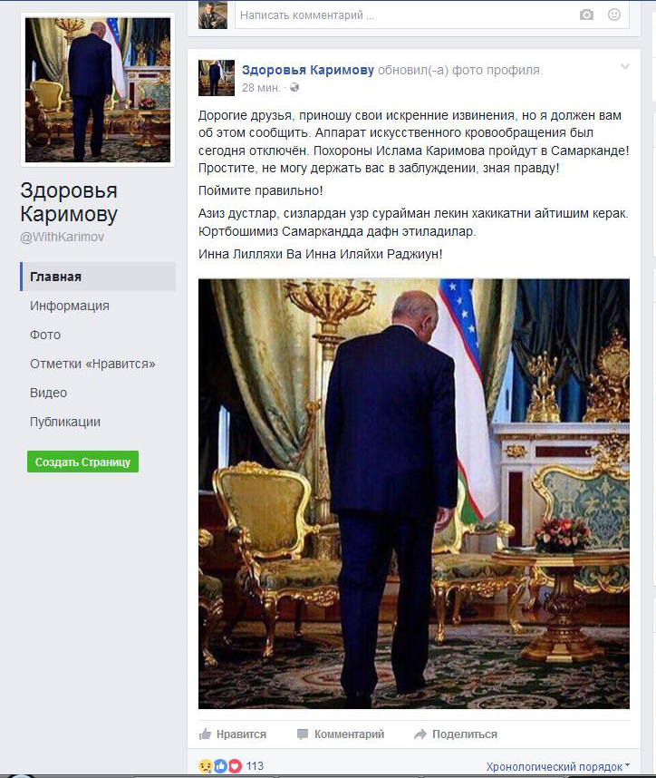 «Дорогие друзья, приношу свои искренние извинения, но я должен вам об этом сообщить. Аппарат искусственного кровообращения был сегодня отключён. Похороны Ислама Каримова пройдут в Самарканде!