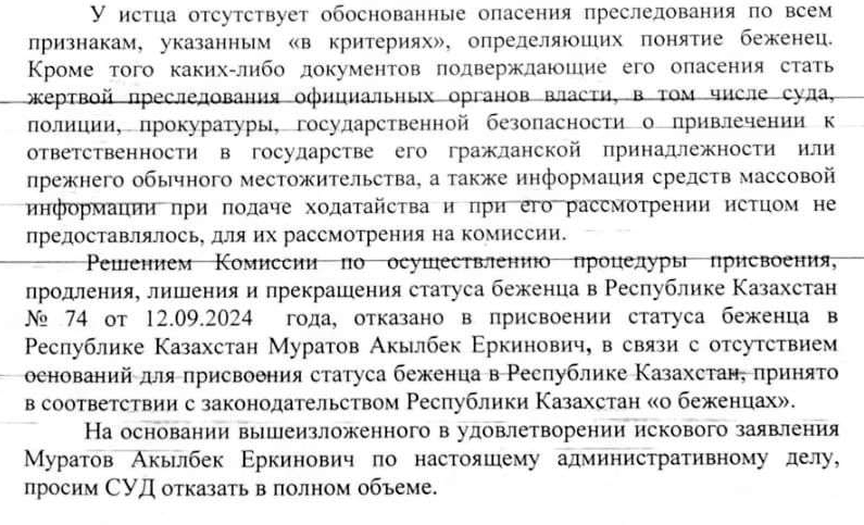 Из отзыва на иск об оспаривании решения Управления занятости и социальных программ г. Алматы в присвоении статуса беженца