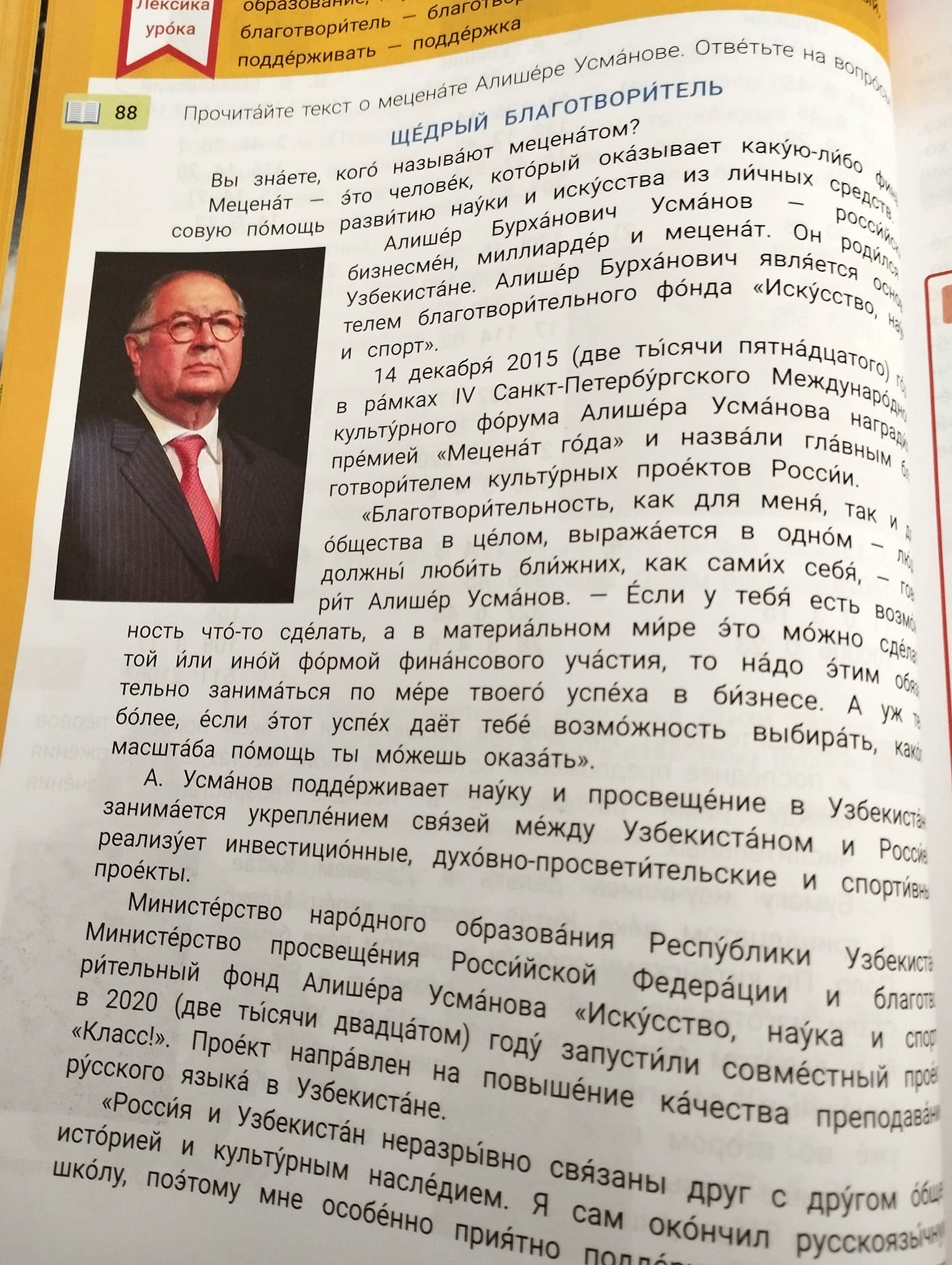 «Перед вами учебник русского языка для школ с нерусским языком обучения в Узбекистане, - высказалась по этому поводу администратор группы Ташкент-СНОС в Фейсбуке Фарида Шарифуллина. - Детей воспитывают на примере успешного путинского предпринимателя, фигуранта санкционных списков и антикоррупционных расследований. Теперь понятны все эти призывы убрать из школы физику-химию и вообще точные науки, которые развивают умение логически мыслить и дают ребенку твердое понимание того, как устроен мир. Такая молодежь не нужна в Янги Узбекистане (Новом Узбекистане – ред.). Нужна такая, которая умеет говорить правильные слова, складывать столбиком прибыль и держать нос по ветру».
