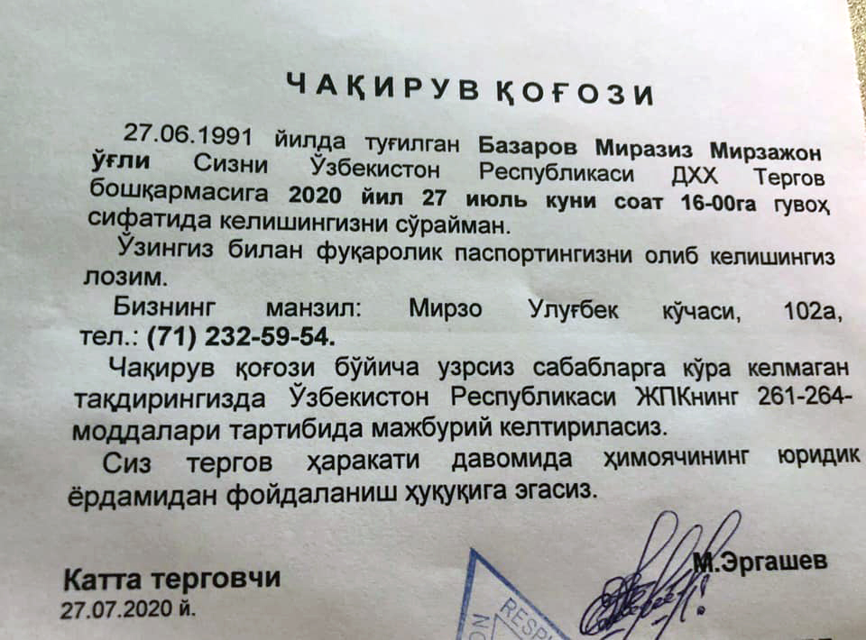 Напомним, что вчера, после публикаций в Фейсбуке, а именно вот этих: «С днем рождения великий, любимый и уважаемый президент страны!» и «Открытое письмо МВФ и АБР». статей Миразиз Базаров был вызван повесткой на допрос в СГБ «в качестве свидетеля» по адресу: [город Ташкент], улица Мирзо Улугбека, 102 а. Повестку прислал старший следователь М. Эргашев.