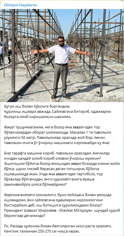 В конце июня Хайдаров в своём телеграм-канале отмечал узость базарных рядов, по которым не сможет проехать пожарная машина. 12 июля он опубликовал в своем телеграм-канале статьи о торговом комплексе в Коканде. Блогер сообщал что около двух тысяч предпринимателей могут остаться без места после реконструкции рынка. По его словам, до пожара они торговали между торговыми рядами у дороги, которая была разделена между продавцами. Хотя здесь торговать было запрещено, администрация рынка якобы дала разрешение на торговлю в обмен на деньги, которые «не шли в бюджет», - с ними не заключали договор аренды.