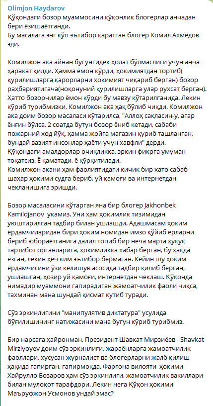 В решении Кокандского городского суда по уголовным делам говорится, что блогер подготовил критический видеоматериал о сокращении площади торговых рядов из-за расширения между ними расстояния для проезда пожарных машин (в июне на рынке был крупный пожар, из-за узких проездов не могли проехать пожарные расчёты).