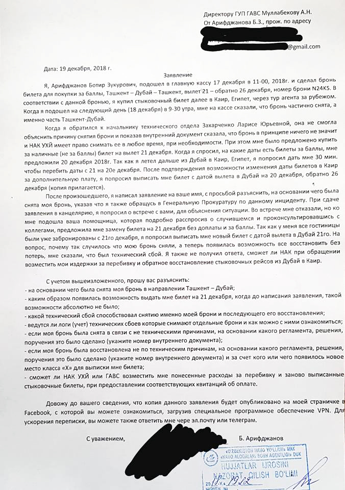 В своем заявлении Батыр Арифджанов адресовал руководству авиакомпании следующие вопросы:
