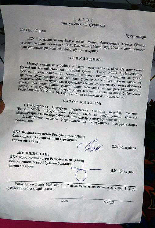 Постановления о производстве обыска по обоим адресам в Караузякском районе были подписаны 17 июля 2023 года следователем Управления СГБ по Республике Каракалпакстан лейтенантом О.Ж.Кдырбаевым, в них указано, что следственные действия проводятся в рамках уголовного дела №350008/2023-20ФВ (детали которого пока неизвестны). Сообщается, что следователь лично участвовал в проведении обысков.