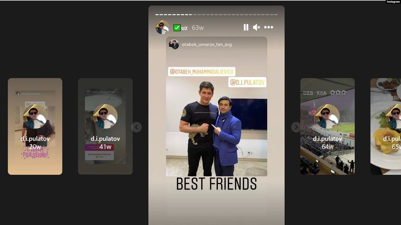 В частности, фотографии и посты на странице в Instagram’е Дильмурода Пулатова свидетельствуют о его «приближенности» к старшему брату его формального партнера Ойбека Умарова – младшему зятю президента Узбекистана Отабеку Мухаммадалиевичу Умарову.