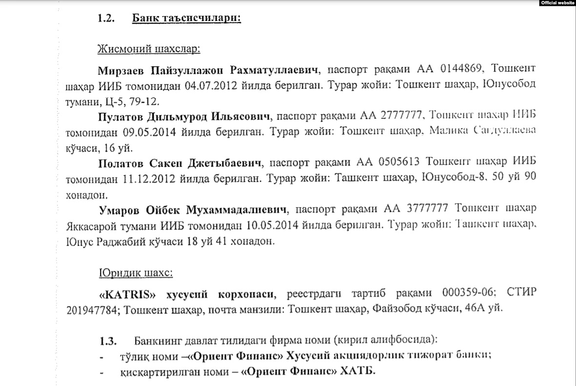 В открытых источниках это имя указано лишь в одной системе – в документах банка «Ориент Финанс» (Orient Finans). Самый старый из этих документов, имеющихся в распоряжении «Озодлика», датирован 2015 годом.