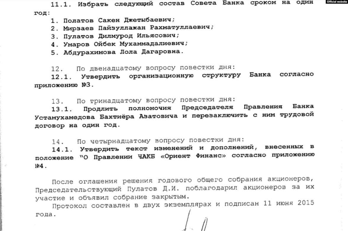 Ойбек Умаров в 2015 году значился также членом Совета управляющих «Ориент Финанс» банка