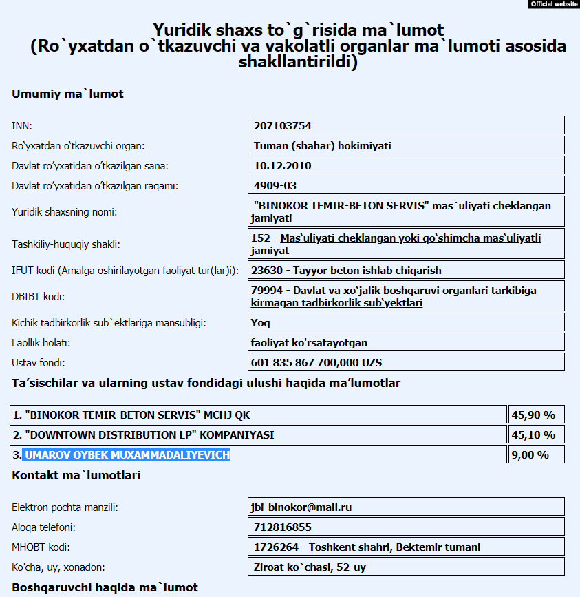 Ойбек Умаров также является крупным акционером ООО Binokor temir-beton с уставным фондом 367,5 млн долларов