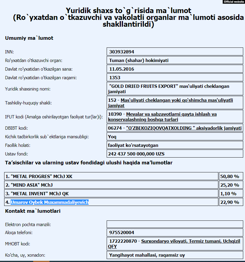 22,9 процента ООО GOLD DRIED FRUITS EXPORT, зарегистрированного 11 мая 2016 года в Сурхандарьинской области с уставным фондом 242.437.500.000 сумов (около 83 миллионов долларов [по официальному курсу ЦБ]);