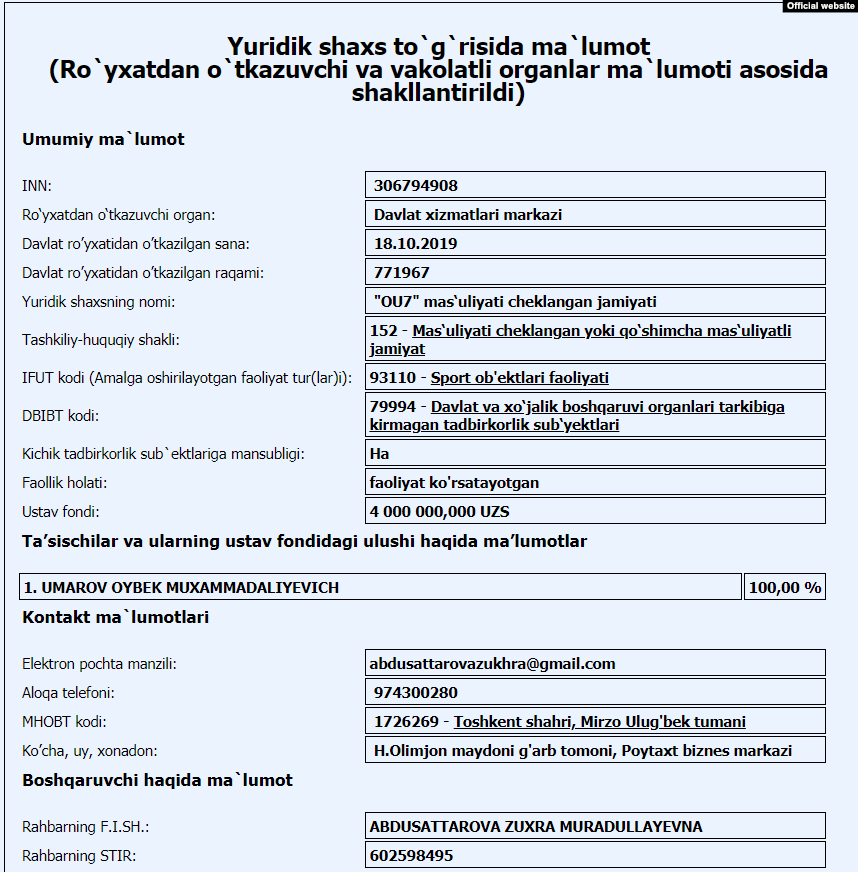 Эта информация напрямую связывает документального владельца бренда OU7 ООО и общественного фонда под аналогичным названием Ойбека Умарова с его старшим братом, с их истинным «автором» и спонсором Отабеком Умаровым.