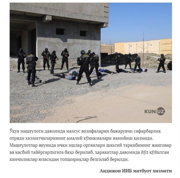 На сей счет в сети имеется даже скриншот публикации от 18 марта 2019 года на узбекском портале Kun.uz, с комментариями пресс-службы Андижанского областного ОВД с места тренировочной практики на предмет профессионально-боевой подготовки силовиков.