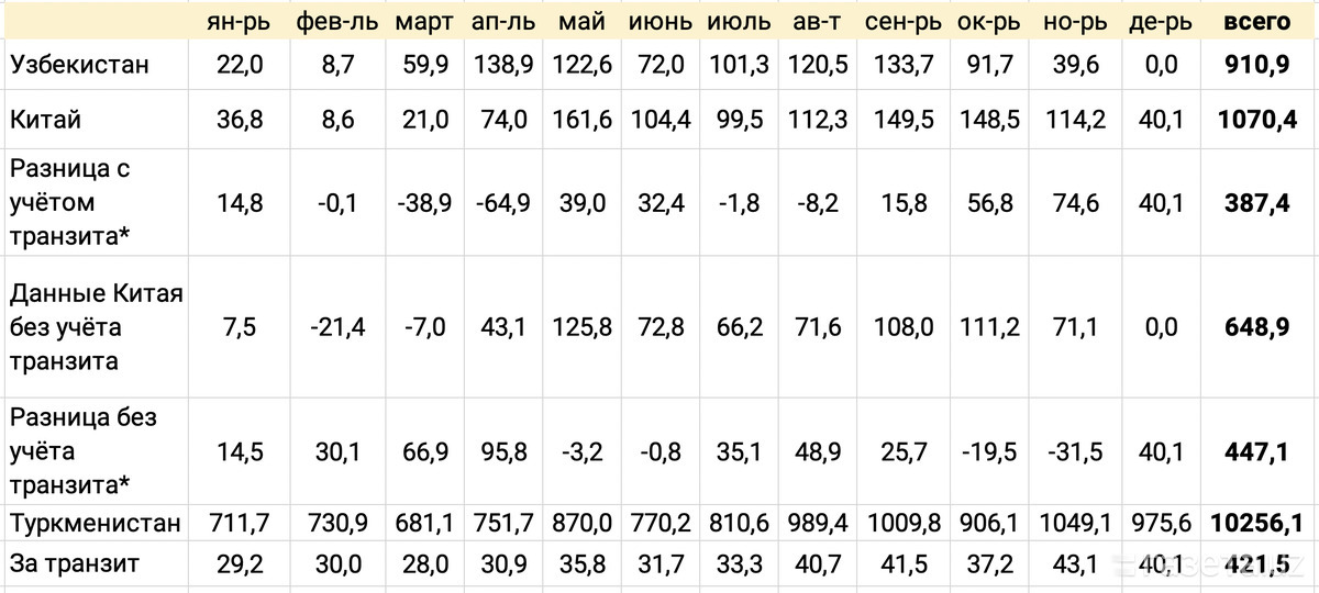 Общая сумма всех разниц за год составляет 387,4 миллиона долларов. По данным Газеты.uz, Узбекистан за транзит газа в 2022 году получил около 400 миллионов долларов.