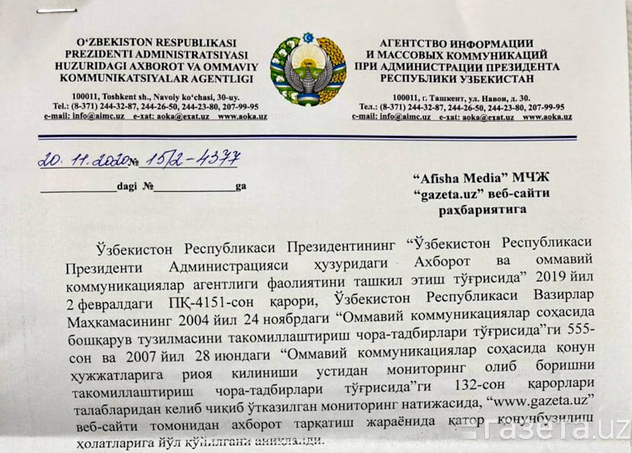 Агентство информации и массовых коммуникаций в лице его директора Асаджона Ходжаева, судя по тональности письма-предупреждения за его подписью, ничуть не сомневается в том, что «проблемы с обеспечением населения газом и электричеством на местах освещены в материале односторонне и с эмоциями». Кун.uz же справедливо расценил послание как давление на свою профессиональную деятельность.