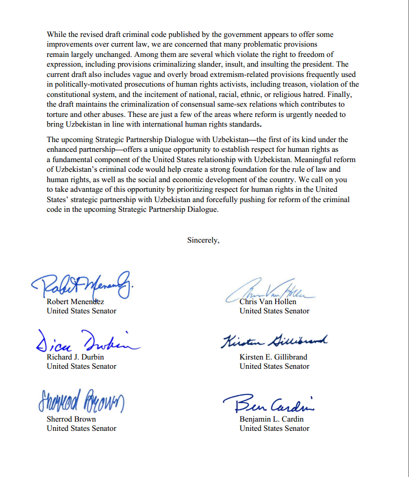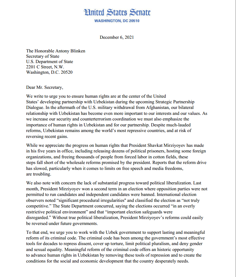 Предстоящий диалог о стратегическом партнерстве с Узбекистаном - первый в своем роде в рамках расширенного партнерства - предлагает уникальную возможность установить уважение к правам человека как основополагающему компоненту отношений Соединенных Штатов с Узбекистаном. Значимая реформа Уголовного кодекса Узбекистана поможет создать прочную основу для верховенства прав человека и прав человека, а также для социально-экономического развития страны. Мы призываем вас воспользоваться этой возможностью, сделав приоритетом уважение прав человека в стратегическом партнерстве Соединенных Штатов с Узбекистаном и решительно продвигая реформу Уголовного кодекса в предстоящем диалоге о стратегическом партнерстве».
