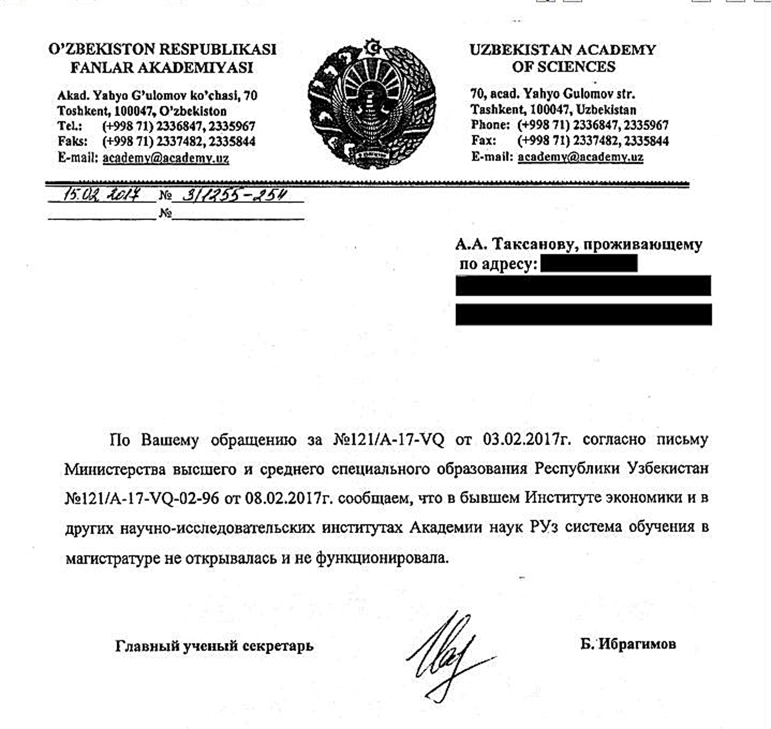 Публицист Алишер Таксанов обратил внимание на заявление Гульнары Каримовой о её учебе в Институте экономики при Академии наук РУз (это нонсенс, так как институт - научно-исследовательский, а не образовательный), написал в Академию наук и попросил предоставить ему данные о магистратуре, о том, сколько человек там училось, кто является деканом и т.д.