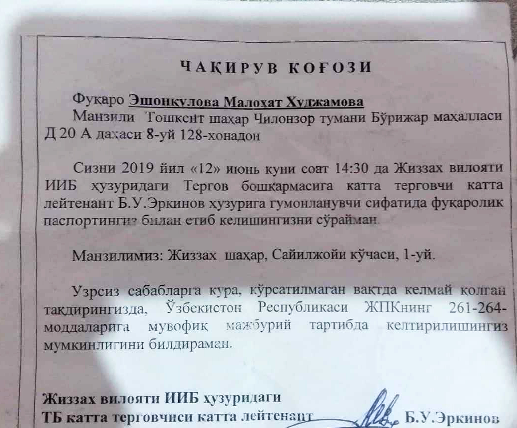 В конце «беседы» следователь отнес начальству толстую папку с документами по делу журналистки, после чего сообщил, что Малохат может быть свободна. На прощание Эркинов вручил ей повестку с предписанием прибыть на следующий день в Джизакское РУВД. И попросил мужчину в футболке, который вопреки требованию закона во время беседы присутствовал в комнате, и, кстати, так и не представился, отправить Малохат в Ташкент.