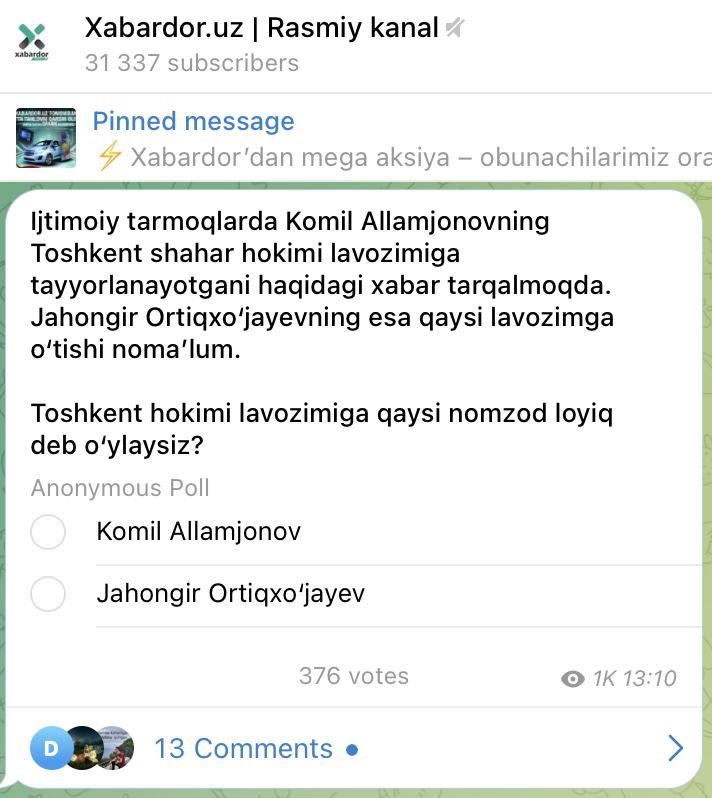 В этом плане можно привести высказывание от администратора/команды Телеграм-канала @tentakminds (название состоит из двух слов - на узбекском и английском языках, что в сочетании означает «глупые умы»), считающего, что слухи о возможном «хокимстве» Алламжонова расплодились не благодаря каким-то вездесущим блогерам, а из-за подачи информации через легально функционирующее интернет-издание.