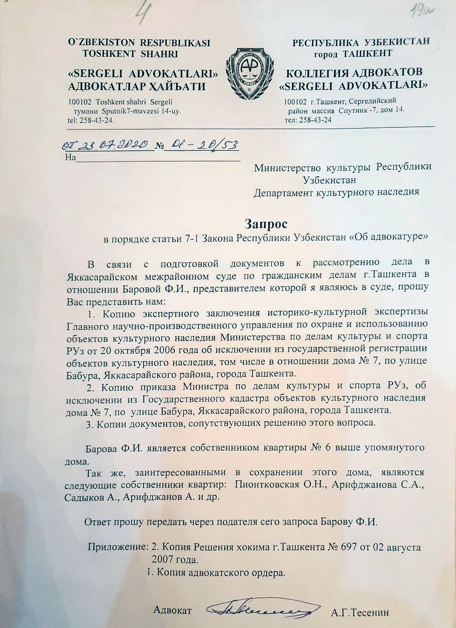 Запрос адвоката по поводу заключения комиссии по решению бывшего мэра Ташкента А. Тухтаева, исключившего 303 здания из числа охраняемых государством