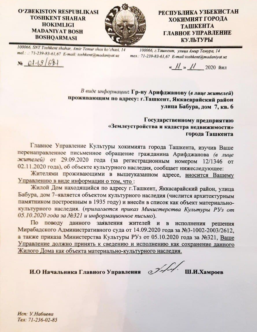 «Ваше управление должно принять к сведению и исполнению сохранение данного жилого дома как объекта материально-культурного наследия», - особо подчеркивает, обращаясь также к кадастровому управлению города, и. о. начальника Главного управления культуры столичной администрации Ш. Хамроев.
