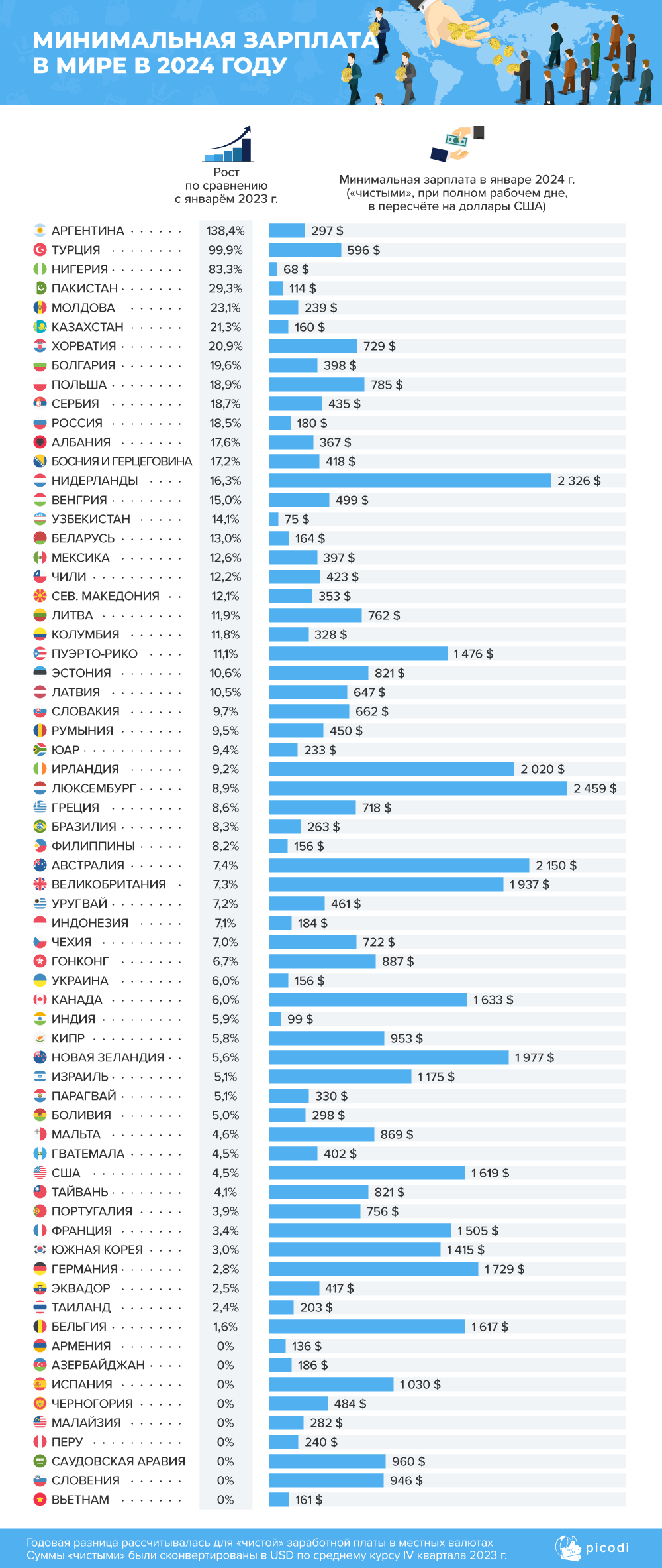 Во Вьетнаме – $161, в Индонезии – $184. в Перу – $240, в Гватемале – $402, в Эквадоре – $417, в Турции – $596.