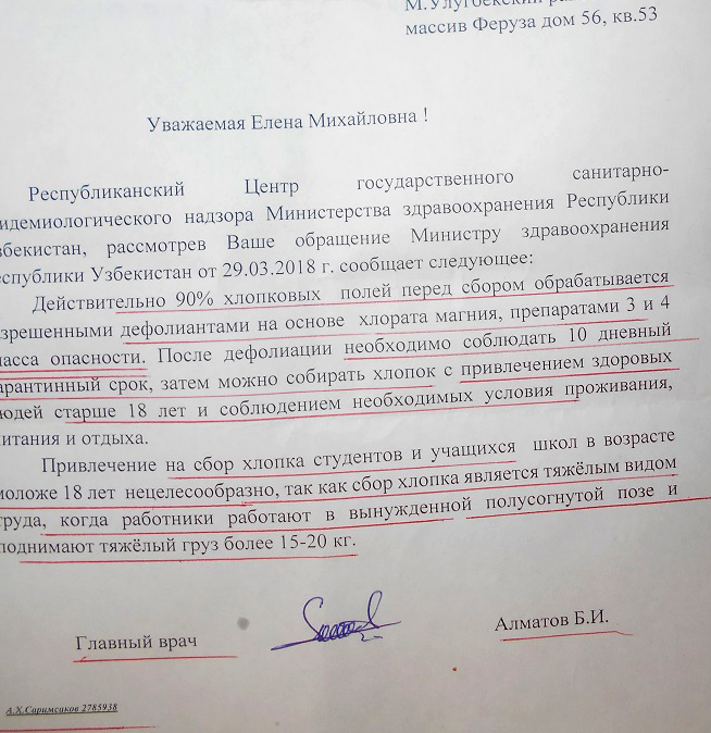 «Действительно 90 процентов хлопковых полей перед сбором обрабатывается разрешёнными дефолиантами на основе хлората магния, препаратами 3 и 4 класса опасности. После дефолиации необходимо соблюдать 10-дневный карантинный срок. Затем можно собирать хлопок с привлечением здоровых людей старше 18 лет и соблюдением необходимых условий проживания, питания и отдыха. Привлечение на сбор хлопка студентов и учащихся школ в возрасте моложе 18 лет нецелесообразно, так как сбор хлопка является тяжёлым видом труда, когда работники работают в вынужденной полусогнутой позе и поднимают тяжёлый груз более 15-20 кг».