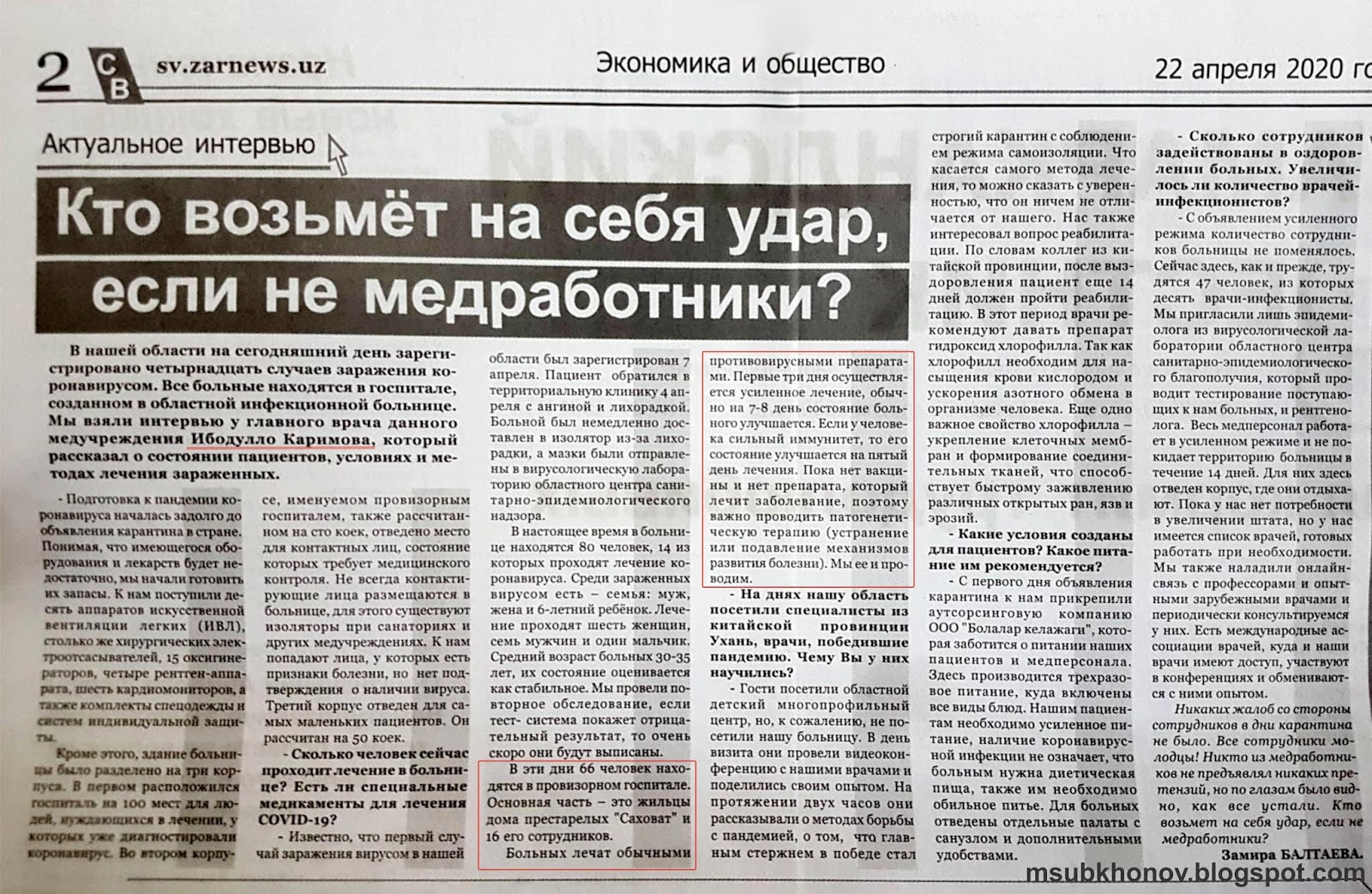 Однако спустя три месяца никаких официальных заявлений о ситуации с жителями дома «Саховат» Самарканда нет. Попытки выяснить, чем все закончилось, и как там живут старики и инвалиды в условиях пандемии также увенчались неудачей, пишет Мирзо Субханов. И выражает просьбу к администрации Самаркандской области предоставить официальную информацию о состоянии здоровья жителей всех домов престарелых области и условий содержания там людей в период карантина и самоизоляции.