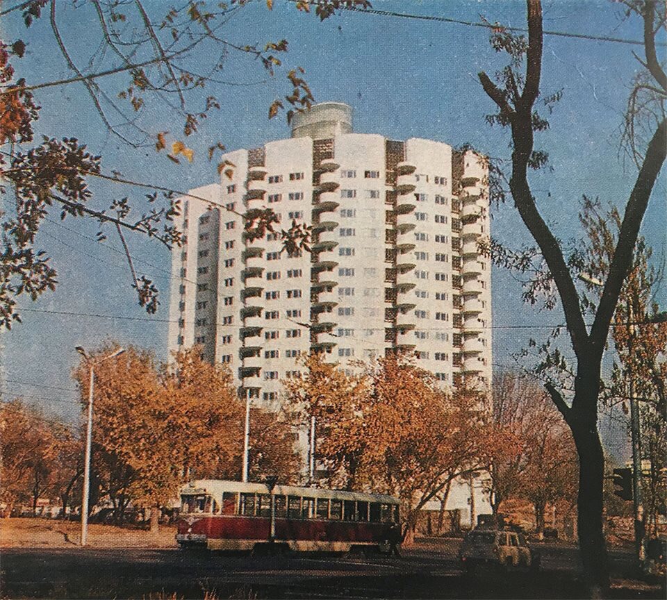 Экспериментальный 16-этажный монолитный жилой дом в Ташкенте, возведенный в 1985 году. Снимок из журнала «Архитектура и строительство Узбекистана», 1986 год