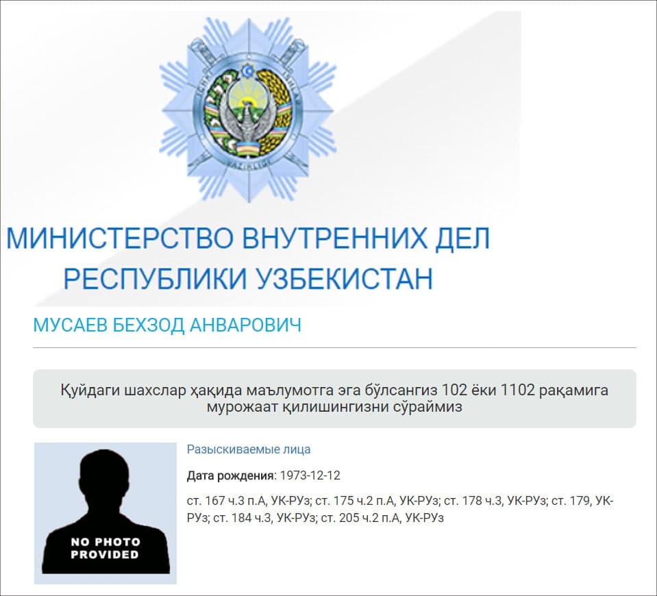 Точная дата подачи в розыск «удачливого бизнесмена-беглеца» не известна. Судя по объявлению на узбекском языке на скриншоте, правоохранительное ведомство обращается «ко всем, кто владеет какой-либо информацией о Мусаеве или его местонахождении, сообщить по телефонам 102 или 1102».