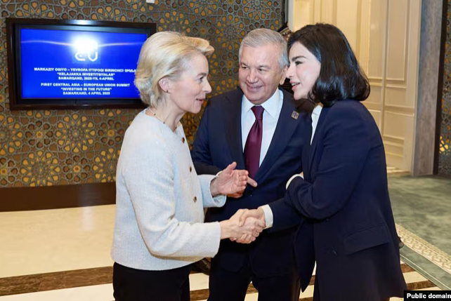 Президент ЕС Урсула фон дер Ляйен с президентом Шавкатом Мирзиёевым и его дочерью Саидой Мирзиёевой. Самарканд, 4 апреля 2025 года