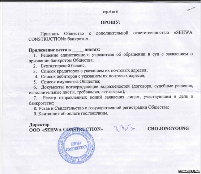В это же время генеральный директор ООО «Sehwa Construction» Чо Джонгюнг обратился в тот же Ташкентский межрайонный экономический суд с просьбой признать его компанию банкротом.