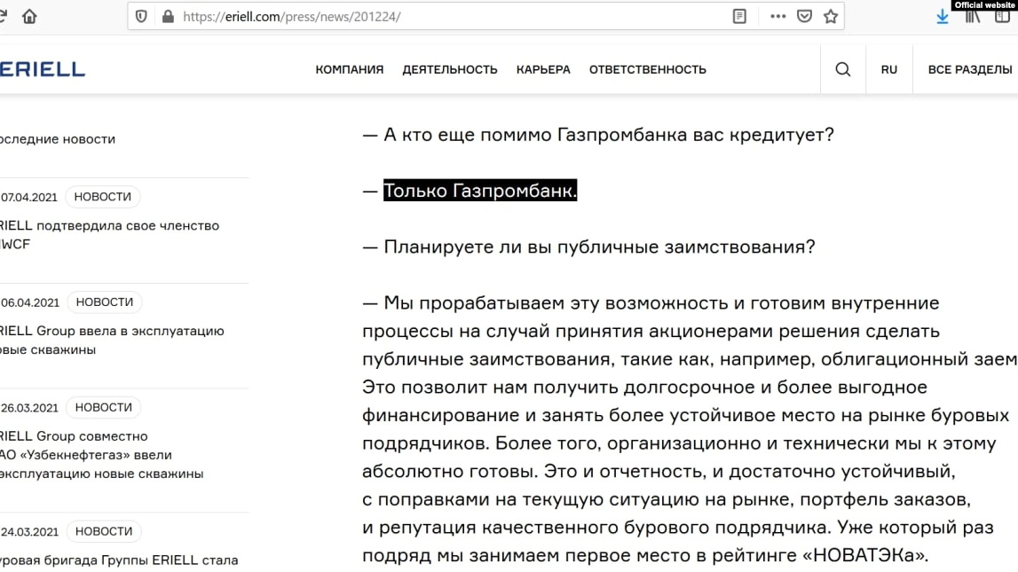 Крупный пакет акций компании Eriell Group, учрежденной олигархом родом из Самарканда Бахтиёром Фазыловым, находится под контролем «Газпромбанка». Согласно информации на сайте компании, ее единственным кредитором тоже является «Газпромбанк».