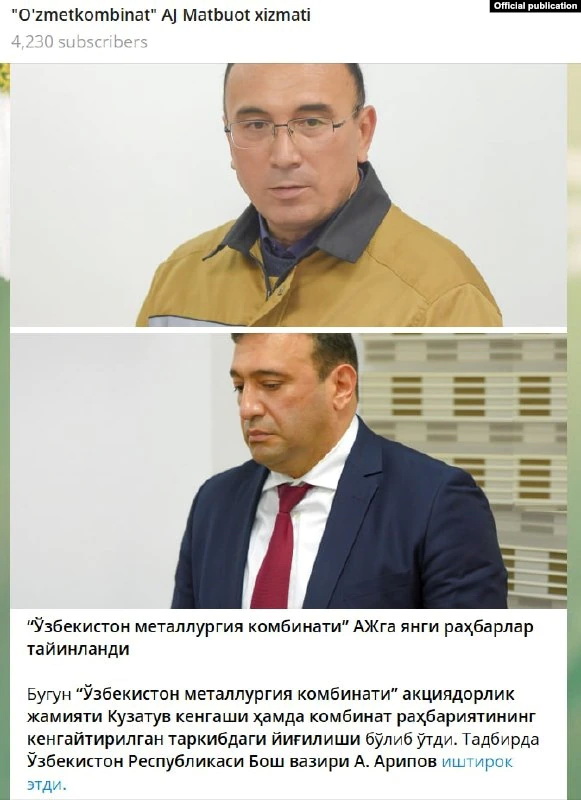 Ранее «Озодлик» писал о том, что 20 января 2021 года премьер-министр Узбекистана Абдулла Арипов лично провел заседание в головном офисе Узбекского металлургического комбината в Бекабаде (Ташкентская область) и сообщил о назначении нового руководства предприятия.